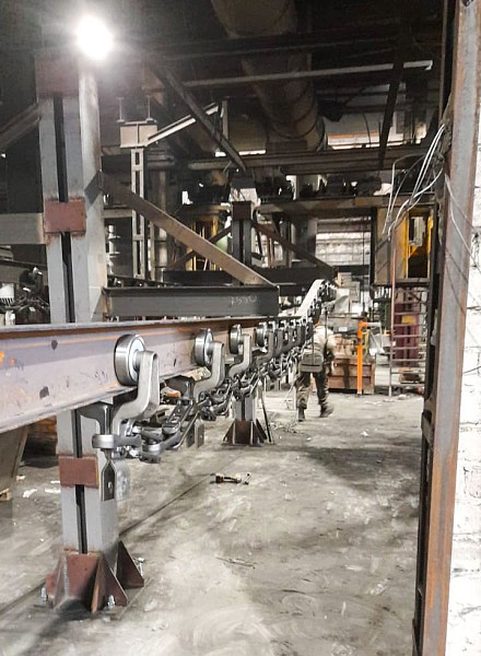 Конвейер используется для внутрицеховой транспортировки изделий, которые неудобно или невозможно перемещать напольными средствами. Подвесная схема освобождает полезную площадь пола и упрощает организацию технологических потоков.